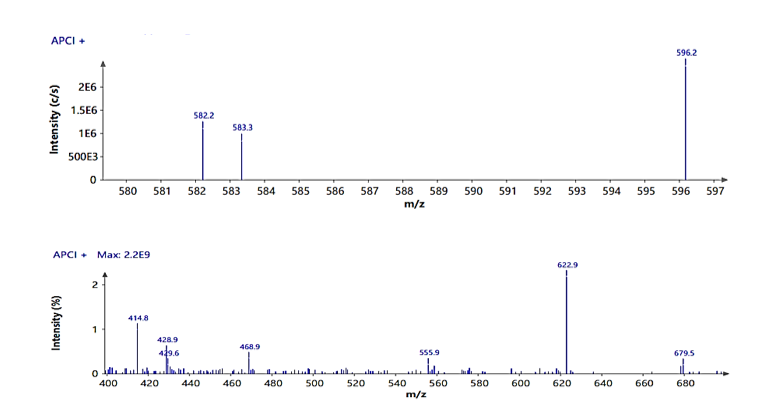 The identification of the newly formed cyclic structure within the lactone ring was further supported by thin-layer Chromatography-Mass Spectrometry (TLC-MS) analysis. The TLC-MS spectrum shown in Figure 5 displays several peaks corresponding to the molecular weight of the synthesized compound, N,N-dimethylcyclohexylamine-hyptolide (3). These analytical data, as summarized in Table 5, were compared with the theoretical molecular weight. The molecular ion peak [M + H]+ of the synthesized N,N-dimethylcyclohexylamine-hyptolide (3) was observed at m/z 596.2, while the [M + Na]+ ion peak was detected at m/z 618.79. These findings demonstrate strong agreement between the experimental results and the calculated molecular weights [26].