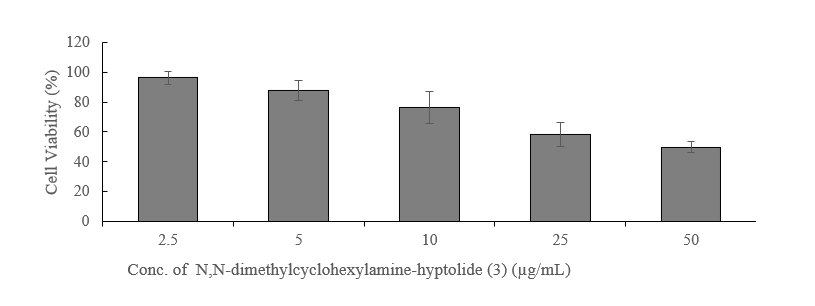 The cytotoxicity assay was performed using the MTT method on Breast Cancer Stem Cells (BCSCs) [16]. BCSCs were seeded at a density of 2×104 cells/mL in 96-well plates and incubated for 24 h. Subsequently, N,N-dimethylcyclohexylamine-hyptolide (3) was added at varying concentrations of 2.5, 5, 10, 25, and 50 µg/mL. Untreated cells served as the negative control (MDEM medium containing 0.01% DMSO). After another 24-hour incubation, the culture medium was removed and replaced with 0.5 mg/mL MTT reagent (Sigma-Aldrich), followed by incubation for 4 h at 37 °C in a 5% CO2 incubator. The formation of formazan crystals, resulting from the mitochondrial conversion of MTT, was stopped by adding SDS (sodium dodecyl sulfate) dissolved in 0.01 N HCl, and the mixture was incubated for 24 h at room temperature. DMSO was then added to dissolve the formed formazan crystals. Absorbance was measured at 595 nm using an ELISA reader (Biorad iMark™ Microplate Reader) [17]. The IC₅₀ value, defined as the concentration that inhibits 50% of cell growth, was calculated using linear regression with the equation y = ax + c, where y represents the percentage of cell viability, and x is the concentration corresponding to y = 50. The IC₅₀ of N,N-dimethylcyclohexylamine-hyptolide (3) was compared to that of Hyptolide (1) for the same cell inhibition assay [14].