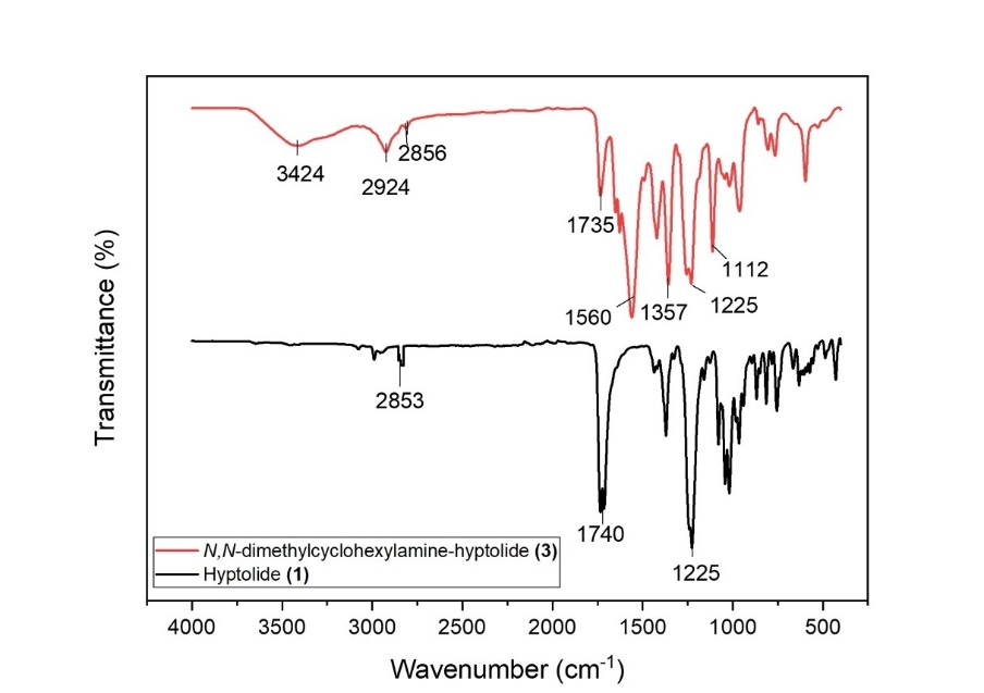 Table 3 The fuctional groups data from the IR analysis of the synthesized compound N,N-dimethylcyclohexylamine-hyptolide (3).