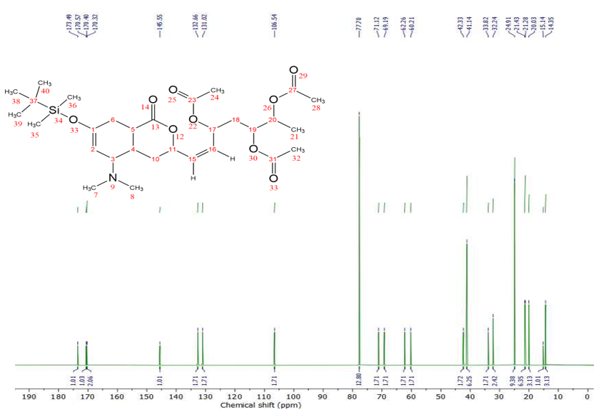The proton and carbon NMR spectra were recorded on a Jeol Resonance at 400 MHz, with CDCl3 used as both the solvent and reference standard. The 1H-NMR spectrum enabled identification of the number, type and arrangement of hydrogen atoms in N,N-dimethylcyclohexylamine-hyptolide (3). The 13C-NMR spectrum allowed for the determination of the number and chemical environments of the carbon atoms present in the compound [13].