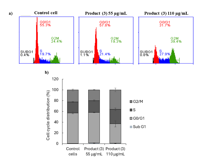 Cell cycle distribution was analyzed using flow cytometry (DB Accuri C6 Plus, BD Biosciences, USA). Breast Cancer Stem Cells (MDAMB-231) were cultured in 6-well plates and treated with N,N-dimethylcyclohexylamine-hyptolide (3) at concentrations of 55 and 110 µg/mL, with doxorubicin serving as a positive control, followed by incubation for 24 h. The cells were then harvested using EDTA-free trypsin and washed twice with pre-cooled phosphate-buffered saline (PBS) and methanol, before being incubated at 4 °C for 15 min. Each tube was then treated with BD Cycletest reagent (BD Biosciences, USA), consisting of 100 µL propidium iodide (PI) (50 µg/mL) and 10 µL RNase A (50 µg/mL), and incubated for 30 min at room temperature, according to the manufacturer’s instructions [5].