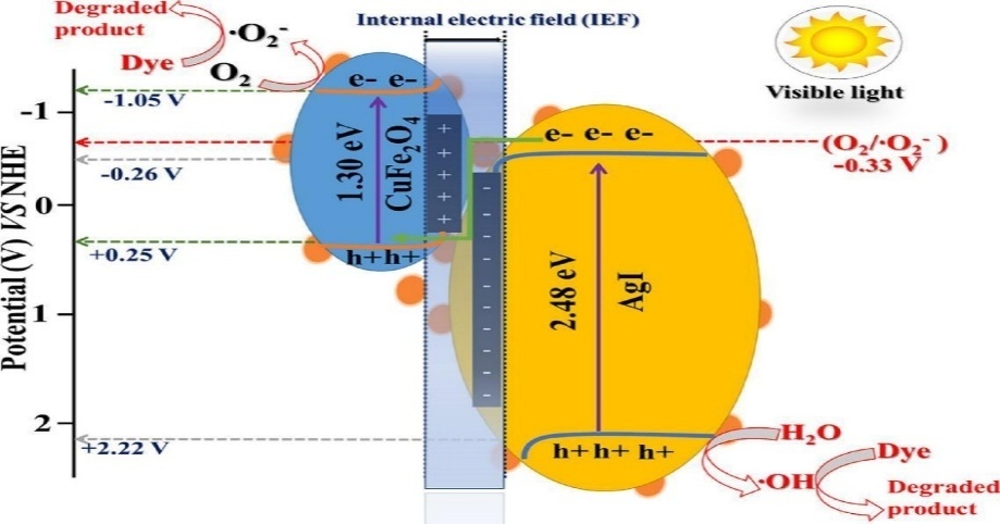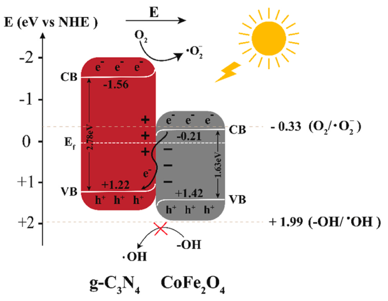 NiFe2O4 was synthesized via sol-gel auto-combustion using glycine as a fuel and combined with TiO2 through solid dispersion to form a NiFe2O4/TiO2 heterostructure. Electrochemical analysis showed NiFe2O4 as p-type and TiO2 as n-type, with NiFe2O4 exhibiting lower charge transfer resistance, enhancing photocatalytic activity. For NiFe2O4, the band gap is found to be 1.64 eV, which allows it to absorb visible light. TiO2 has a band gap of 3.21 eV, making it effective in absorbing UV light. The mixture of wavelengths in the heterostructure attempts to use both visible and UV light for photocatalytic activities. Solar irradiation (hv > Eg) causes electrons to travel from the conduction band (CB) of p-NiFe2O4 to the CB of n-TiO2, while holes move from the valence band (VB) of n-TiO2 to the VB of p-NiFe2O4, preventing charge carrier recombination. Hydroxyl radicals (•OH) generated by water reduction on the n-TiO2 surface attack Congo red dye molecules. The unique band positions of p-NiFe2O4/n-TiO2 facilitate the reduction of O2 to superoxide (O2•−), forming a Z-scheme photocatalytic system. This mechanism leads to a 97% degradation efficiency of Congo red dye after 180 min of sunlight irradiation [207].