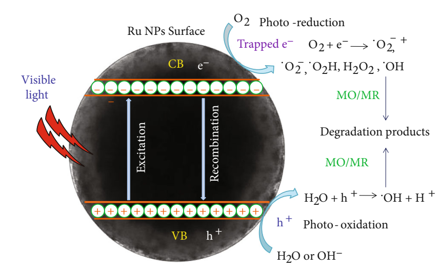 Due to its many benefits and wide range of uses in environmental remediation, especially the removal of contaminants from wastewater, the use of photo catalysts in aqueous suspension has attracted a lot of attention [130]. The process known as photocatalysis occurs when substances like metal oxides, semiconductors, and organic molecules function as catalysts when exposed to light, facilitating chemical reactions that are fueled by light energy. In contrast to traditional catalysis, photocatalysis uses visible or ultraviolet (UV) light to activate a photocatalyst, increasing the pace of a chemical reaction. Because the materials’ catalytic qualities are essential to the process, choosing the right photocatalysts is essential to attaining superior photocatalytic performance. These characteristics include things like the availability of oxidizing agents, band-gap values, and electron-hole recombination rates. To maximize the photocatalytic reaction, factors pertaining to the manufacturing of photocatalysts and the properties of pollutants must also be carefully considered. In order to enhance the photocatalytic properties of a material, various methodologies have been employed, such as surface modification, incorporation of dopants, fabrication of composites, and the development of heterostructures [131]. A potent illumination source, an appropriate photocatalyst (such as MFe2O4), and a suitable oxidizing agent are indispensable for the photocatalytic degradation of organic pollutants. The initiation of the process is facilitated by the excitation of electrons from the valence band (VB) into the conduction band (CB) through the absorption of photons possessing energies that exceed the material’s band-gap energy (Eg). In contrast, photons characterized by longer wavelengths or reduced energy typically dissipate energy in the form of heat. According to Figure 1, the photocatalytic reaction stages entail the semiconductor material absorbing light, which causes electrons to go from the VB to the CB and leave a hole in the VB.
