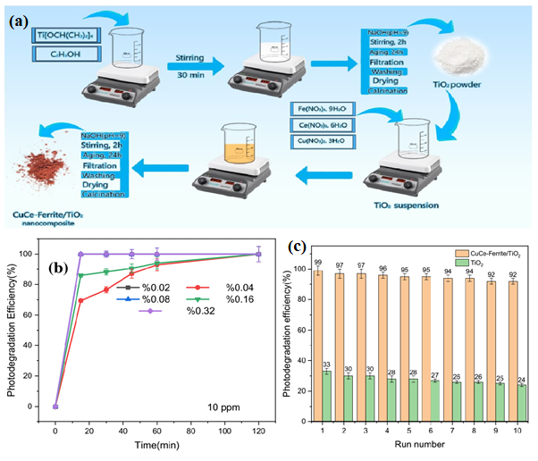 Figure 2 (a) Schematic of the synthesis process for CuCe-Ferrite/TiO2; (b) Performance of CuCe-Ferrite/TiO2 NPs in degrading 10 ppm R250 dye over various time intervals; (c) Longevity of CuCe-Ferrite/TiO2 and TiO2 NPs after ten usage cycles [205].