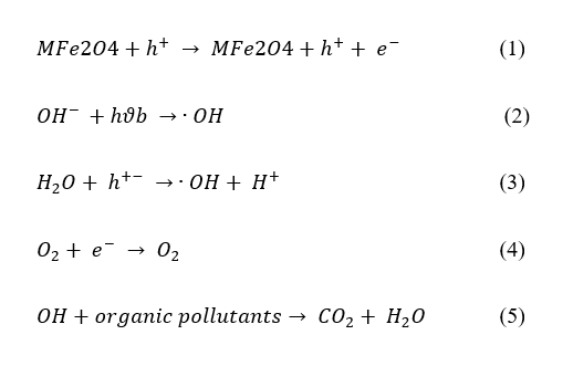 The efficiency of the photocatalyst is determined by the band gap, an energy barrier that separates these bands and inhibits electron-hole recombination. Through scavenging, the hydroperoxyl radical that is created during this process prolongs the life of the photogenerated holes. On the surface of the photoexcited photocatalyst, oxidation and reduction activities occur [132]. Electrons and holes recombine when oxygen eliminates the electrons, producing superoxide radicals (O2−), which in turn produce hydrogen peroxide (H2O2) and hydroperoxyl radicals (HO2−). Intermediates and final products are the result of additional interactions between these reactive species. Photonic activation of the catalyst is the first step in an effective photocatalytic system [132]. The following describes the next steps in using UV light to activate MFe2O4 in order to eliminate organic pollutants [133]. In summary, steps 1 to 5 show how the photocatalytic oxidation cycle produces hydroxyl radicals (OH-). A positive hole and an electron are produced at the VB and CB, as well, when sunlight strikes MFe2O4 (Eq. (1)). When positive holes, hydroxide (OH), and water (H2O) mix, hydroxyl radicals (OH−) are created (Eqs. (2) and (3)). The presence of oxygen inhibits electron-hole recombination, and these hydroxyl radicals are the main agents responsible for decomposing organic pollutants. Furthermore, the interaction of oxygen (O2) with electrons produces superoxide anions (Eq. (4)). Electron build-up in the CB may enhance electron and hole recombination, lowering photocatalytic efficiency, if oxygen reduction and pollutant oxidation are not coordinated. Therefore, improving the effectiveness of photocatalytic degradation requires preventing electron accumulation. Lastly, organic contaminants are broken down into carbon dioxide (CO2) and water (H2O) by hydroxyl radicals (OH−) binding to them (Eq. (5)).