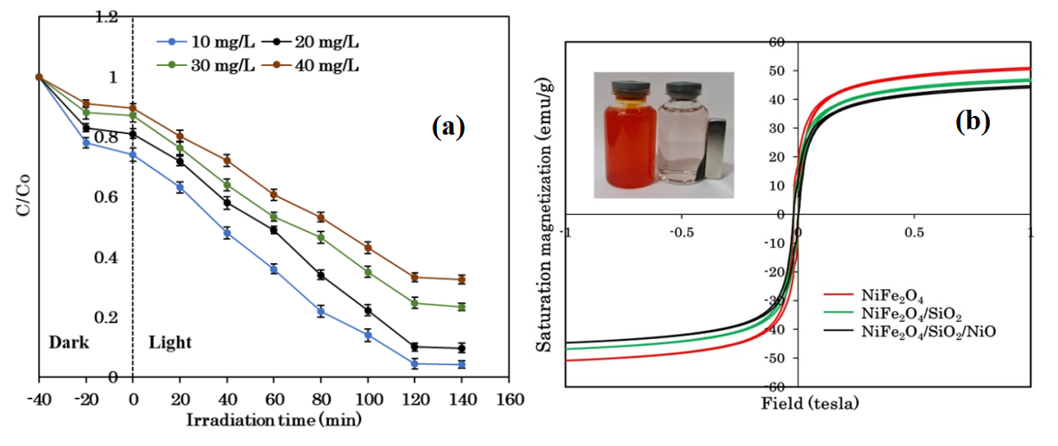 The straightforward synthesis process, cost-effectiveness, elevated electrical resistivity, limited bandgap energy, magnetic permeability, substantial charge transfer capability, non-toxic nature, recyclability, as well as exceptional thermal and chemical resilience represent merely a selection of the prominent properties associated with spinel ferrites [77,78]. Because of these characteristics, ferrites can be used in a wide range of applications, including gas sensors, medication delivery, electronic devices, biomedical devices, information storage, mobile communication, water splitting, water treatment, and catalysis. Their narrow bandgap (1.5 - 2 eV) allows them to serve as effective photocatalysts under visible light, which is particularly useful for environmental remediation applications, including wastewater treatment. Spinel ferrites exhibit significant promise for the photocatalytic destruction of organic contaminants in wastewater treatment. Because of their tiny bandgaps, visible light can be used efficiently, which helps pollutants mineralize into innocuous byproducts like CO2 and H2O. This method reduces waste generation compared to traditional treatment techniques. Additionally, the magnetic properties of spinel ferrites make it easier to separate them from the reaction mixture after the degradation process, thus allowing for easy reuse in continuous catalytic cycles. Numerous approaches have been investigated to improve spinel ferrites’ photocatalytic activity. These include the creation of mixed ferrites, doped ferrites, hybrid heterojunctions, and nanocomposites based on ferrite [79-84]. For example, the photocatalytic degradation of azo dyes under sunlight has been examined for Co-Ni mixed ferrite (Co0.5Ni0.5Fe2O4). Electrons are excited by light absorption, creating electron-hole (e-h) pairs that take part in redox reactions and release reactive radicals (such O2−•) that break down the dye [85]. Additionally, doping Co-Ni mixed ferrite with Ce has been shown to lower its bandgap, enhancing its visible light absorption and improving photocatalytic efficiency by reducing electron-hole recombination [86].