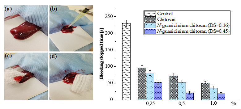Analysis of the presented data indicates that all tested samples reduce bleeding time compared to the control. The difference is particularly pronounced when using 0.25% - 1.0% solutions of chitosan derivatives modified with guanidinium groups. At all investigated concentrations (0.25%, 0.5% and 1.0%), the N-guanidinium chitosan samples exhibit significantly higher hemostatic activity than unmodified chitosan, as evidenced by shorter hemostasis times. Specifically, the bleeding times observed for 0.1%, 0.25%, and 0.5% chitosan solutions were 90 ± 8, 79 ± 7, and 52 ± 6 s, respectively. In contrast, application of N-guanidinium chitosan solutions (DS = 0.16 and 0.45) at concentrations of 0.25%, 0.5%, and 1.0% resulted in bleeding times of 78 ± 9 and 55 ± 7, 52 ± 6 and 21 ± 5, 34 ± 8 and 18 ± 6 s, respectively. The enhanced hemostatic performance of N-guanidinium chitosan at higher DS may be attributed to more efficient electrostatic interactions with negatively charged blood components.