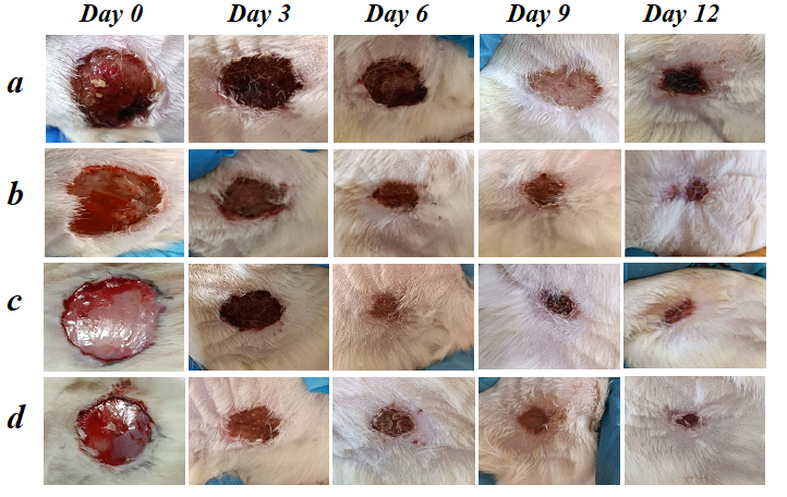 In contrast to the control group, the application of a 0.5% chitosan solution significantly accelerated wound healing (Figure 9). In the treated group, the wound areas on was 3rd, 6th, 9th, and 12th were 1.8 ± 0.07, 1.6 ± 0.03, 1.2 ± 0.08, and 0.6 ± 0.05 cm2, respectively, with corresponding healing rates of 28%, 36%, 52%, and 76%. Moreover, the phases of the reparative process including wound edge and bed condition, necrotic tissue clearance, scab formation, and subsequent epithelialization progressed more rapidly in this group compared to the control, indicating enhanced therapeutic efficacy of chitosan treatment.