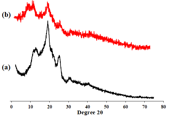 Figure 7 XRD chitosan (a) and N-guanidinium DS = 0.45 (b).