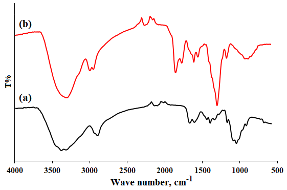 Chitosan displayed characteristic bands at 1,643 and 1,556 cm−1 which are related to amide I & II, respectively, 1,082 cm−1 (C-O stretching), 2,945 - 2,864 cm−1 (-CH stretching), 1,376 cm−1 (-СН3 stretching) and at 3,448 cm−1 (-NH2 and -OH stretching). For N-guanidinium chitosan, new bands appeared at 1,664, 1,570 and 1,258 cm−1 owing to stretching of C=N, C=NH2 + and C-N of the guanidinyl group, respectively (Figure 4).