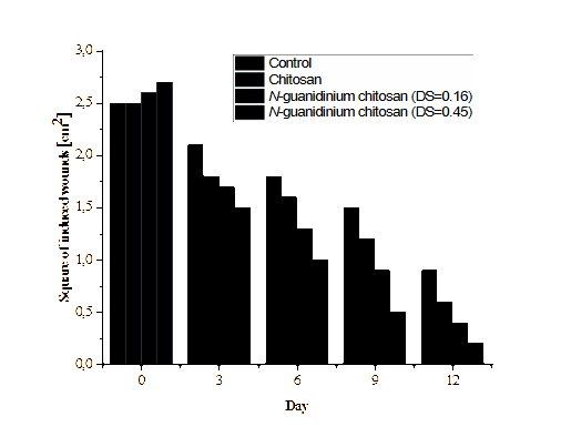 More effective wound healing was observed with the application of 0.5% solutions of the synthesized N-guanidinium chitosan samples. When wounds were treated with a 0.5% solution of N-guanidinium chitosan with a degree of substitution of 0.16, the wound areas on days 3rd, 6th, 9th, and 12th were 1.7 ± 0.08, 1.3 ± 0.1, 0.9 ± 0.08, and 0.4 ± 0.07 cm2 respectively, corresponding to healing rates of 36%, 48%, 65%, and 85%. These findings demonstrate that the presence of guanidinium groups in the chitosan structure contributes to a significant acceleration of wound healing compared to both the control group and the group treated with a 0.5% chitosan solution.