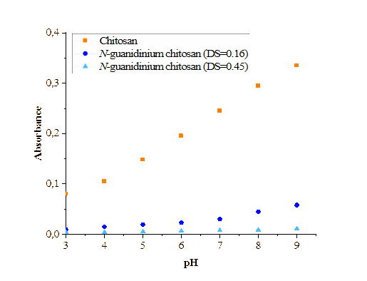 The dependence of chitosan and N-guanidinium chitosan sample solubility on pH was investigated as a function of the DS. Figure 8 shows the variation in optical density (absorbance) of chitosan and its derivatives with different DS values as a function of pH. As shown in the graph, native chitosan exhibits the highest absorbance values, which increase with rising pH, reaching a maximum at pH 9. This trend is associated with a gradual decrease in chitosan solubility as the pH increases from 3 to 9, leading to the formation of insoluble particles and a corresponding rise in optical density. In contrast, N-guanidinium chitosan samples with DS = 0.16 and 0.45 show significantly lower absorbance values across the entire pH range. The sample with a higher degree of substitution demonstrates especially low absorbance, which may indicate enhanced solubility and improved solution stability due to the presence of a greater number of guanidinium groups. This also suggests an increase in the hydrophilicity of the modified chitosan.