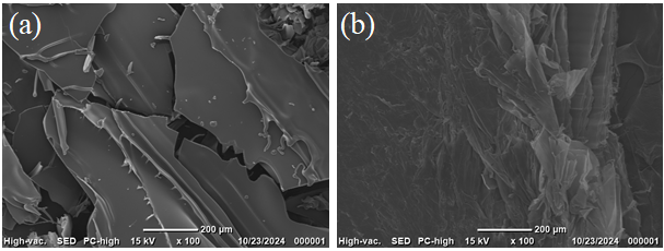The obtained SEM results enabled visualization of the surface morphological features of chitosan (Figure 6). The SEM image of chitosan reveals a plate-like structure with characteristic cracks and fractures, which may indicate the brittleness of the material after drying. The surface appears relatively smooth, with occasional defects and microcracks, suggesting a possible oriented arrangement of macromolecules. The presence of sharp edges and brittle fractures may be indicative of crystalline regions within the chitosan matrix. In contrast, the SEM image of N-guanidinium chitosan exhibits a loose, disordered structure with pronounced layering and a lack of well-defined edges, which suggests the occurrence of biopolymer amorphization during modification.