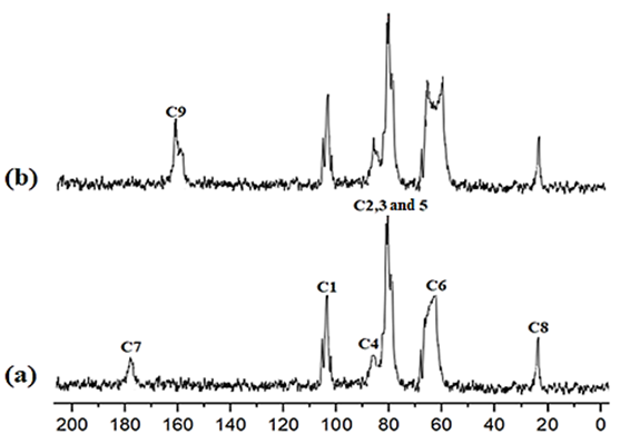 Figure 5 13C NMR of chitosan (a) and N-guanidinium chitosan with DS = 0.45 (b).