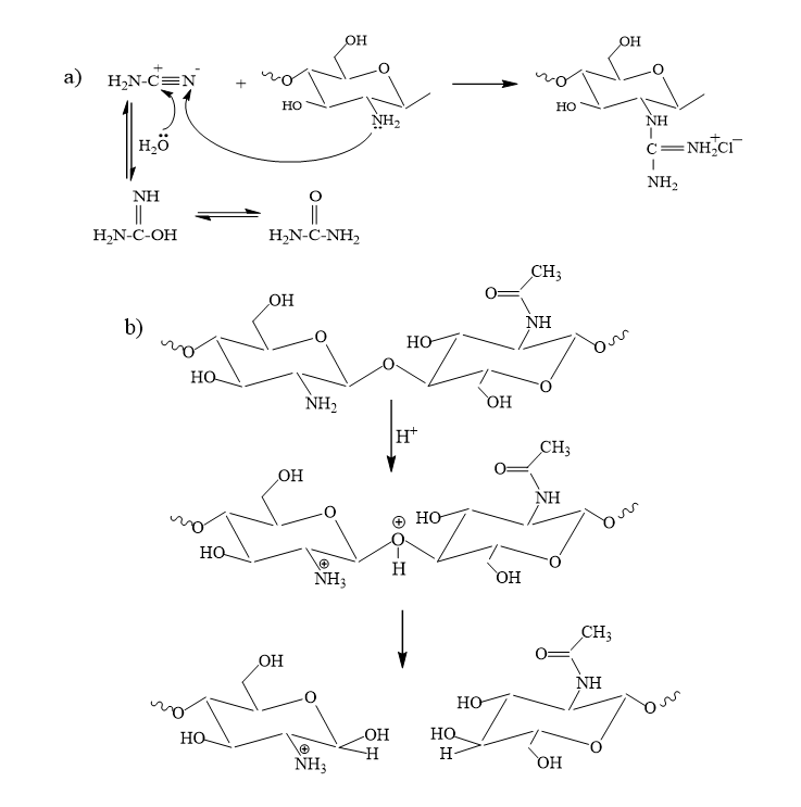 One of the reagents commonly used for the introduction of guanidine fragments into the chitosan backbone is cyanamide. Several studies have demonstrated the feasibility of its application for the guanidinylation of chitosan in the presence of aqueous acid solutions, which act both as solvents and as catalysts for the reaction [19,20]. However, despite the potential viability of this synthetic approach, its implementation is associated with a number of significant limitations, primarily related to the instability of cyanamide in acidic media. Under protonic conditions, cyanamide is prone to hydrolytic decomposition, leading to the formation of undesirable by-products and a marked decrease in the efficiency of guanidine group transfer to the polymer chain (Figure 1(a)). As a result, the reaction may proceed non-selectively, yielding side products and lowering the degree of functionalization of the chitosan matrix. An additional factor limiting the use of acidic solutions is the susceptibility of chitosan macromolecules to acid-catalyzed hydrolysis, which leads to polymer chain scission and a significant reduction in molecular weight (Figure 1(b)). This degradation process becomes particularly pronounced at elevated temperatures, necessitating the development of reaction conditions that minimize destructive side reactions. From a chemical standpoint, the guanidination of chitosan in the presence of aprotic solvents is of considerable interest due to its potential to enhance the efficiency of functional group modification. The use of aprotic solvents, particularly acetonitrile, can significantly increase the reactivity of the primary amino groups of chitosan by preventing their protonation. Moreover, the application of aprotic media helps to minimize side reactions such as the decomposition of cyanamide or the hydrolysis of the chitosan macromolecule.