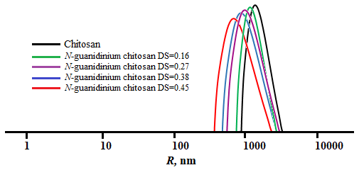 The Figure 3 shows the particle size distribution by hydrodynamic radius (R, nm) for the native chitosan and its synthesized N-guanidinium chitosan derivatives. Analysis of the obtained curves enables the evaluation of the effect of the DS on the size characteristics of the samples in solution. The hydrodynamic diameter of unmodified chitosan ranges from approximately 900 to 5,800 nm and exhibits a unimodal numerical distribution pattern. For the derivative with DS = 0.16, the distribution remains close to that of the unmodified polymer, whereas a notable shift toward smaller radii is observed for samples with DS = 0.27 and 0.38. The most pronounced reduction in particle size is recorded for the derivative with DS = 0.45, for which the main peak of the distribution lies within the range of 650 - 4,100 nm. The presented data suggest that an increase in the DS of the synthesized chitosan derivatives leads to a more compact organization of the particles.