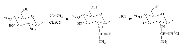 Chitosan 1 g was dispersed in 100 mL of acetonitrile and stirred for 2 h. After swelling, cyanamide was added at a molar ratio of chitosan:cyanamide = 1:1 - 4. The reaction mixture was stirred for 10 h at 80 °C, after which the resulting precipitate was separated by decantation, dissolved in 1% hydrochloric acid solution, and re-precipitated with acetone. The obtained precipitate was then dissolved in water and purified by dialysis for 48 h, with 5 changes of dialysis water. Finally, the dialysate was freeze-dried. The degree of substitution (DS) guanidinium derivatives was calculated according to the C/N wt% from the elemental analysis [23].