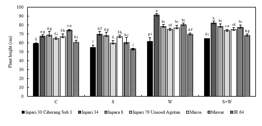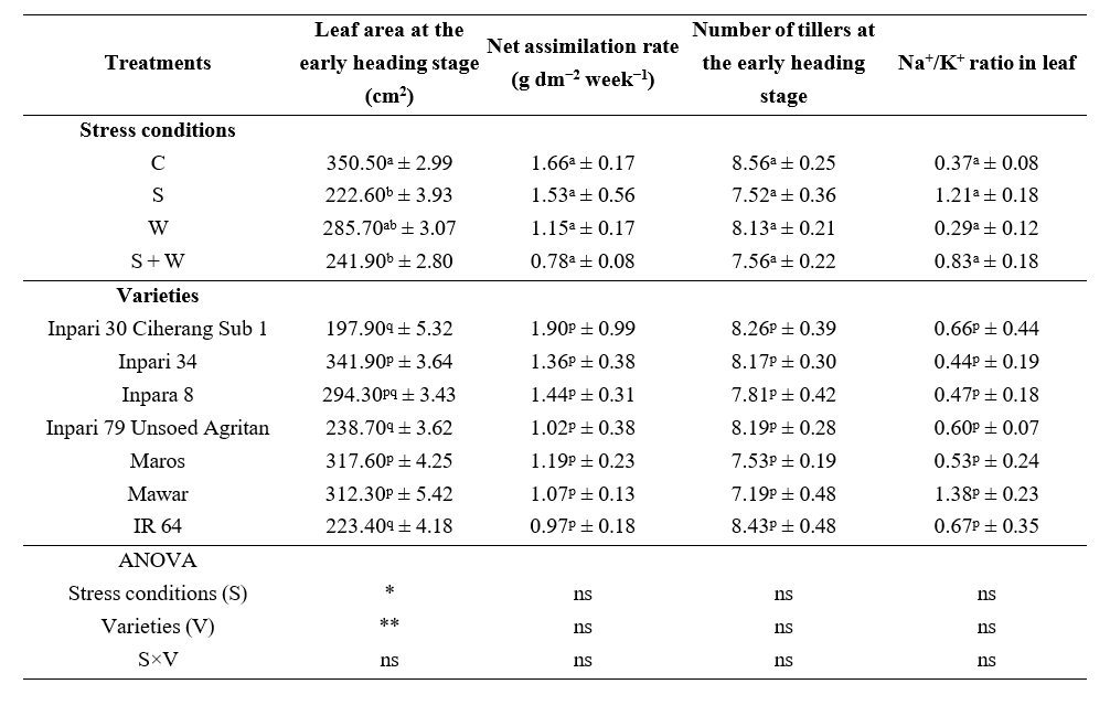 Based on Table 1, the net assimilation rate revealed no significant differences among the 7 rice varieties tested, a finding also observed in the number of tillers. Single and dual stress impair the plant ability to develop optimally, even in susceptible varieties. Tolerant and susceptible rice varieties can exchange carbon dioxide, resulting in relatively stable biomass across various genotypes, even under abiotic stress [44]. This condition affects the growth of other plant organs, including tillers and plant height.