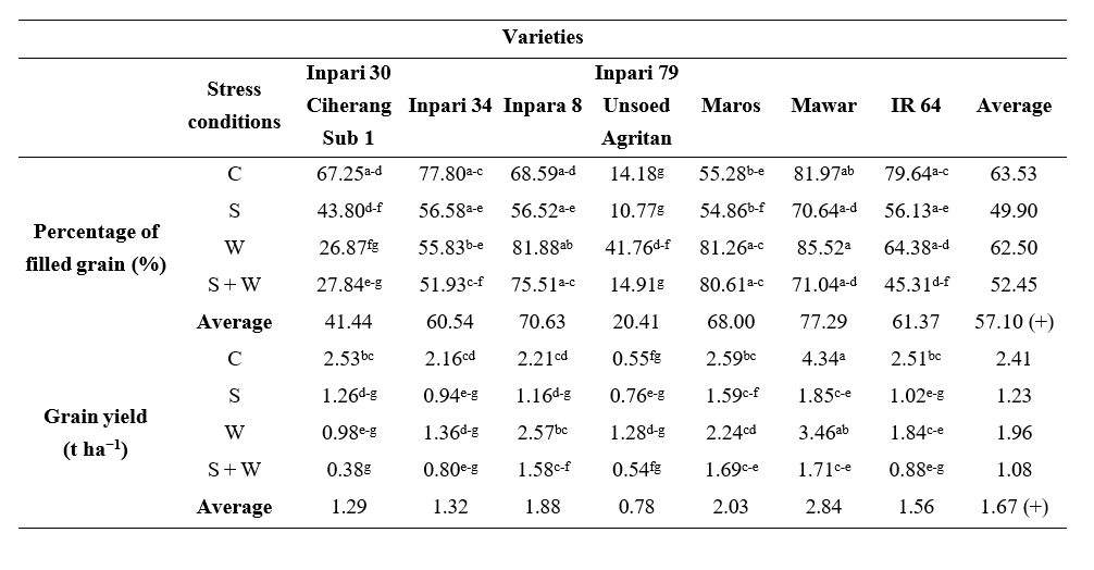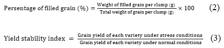Table 3 Interaction between stress conditions and rice varieties on the percentage of filled grains and grain yield.