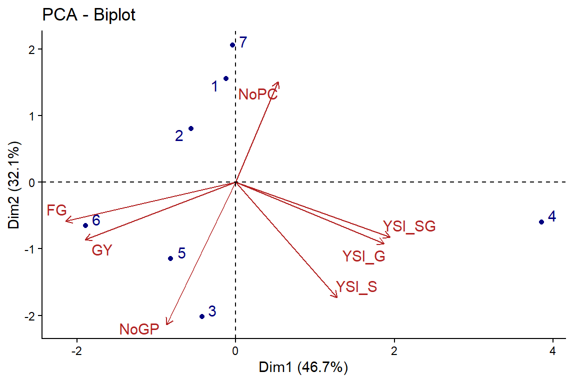 Figure 7 Grouping rice varieties based on YSI, grain yield, and yield component using principal component analysis. Remarks: NoPC (panicle number per clump), PFG (percentage of filled grains), NoGP (grain number per panicle), GY (grain yield), YSI_S (YSI under salinity), YSI_W (YSI under waterlogging), YSI_SW (YSI under dual salinity and waterlogging), 1 (Inpari 30 Ciherang Sub 1), 2 (Inpari 34), 3 (Inpara 8), 4 (Inpari 79 Unsoed Agritan), 5 (Mawar), 6 (Maros), 7 (IR 64)