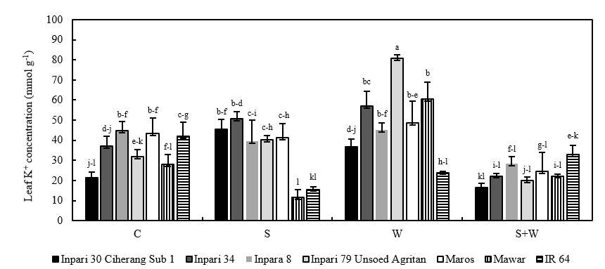 Figure 2 Interaction between stress conditions and rice varieties on leaf K+ concentration at 8 WAP. Remarks: Bars represent mean values of 3 replicates with error bars showing the standard error (SE). Different letters represent significant differences in the interaction between stress conditions and rice varieties based on DMRT at α = 5%; C (control); S (salinity); W (waterlogging); S + W (dual salinity and waterlogging).