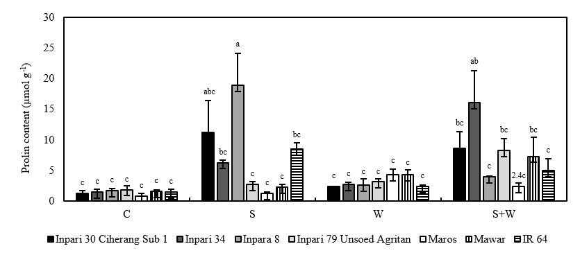 Figure 3 Interaction among stress conditions and rice variety on proline content. Remarks: Bars represent mean values of 3 replicates with error bars showing the standard error (SE). Different letters represent significant differences in the interaction between stress conditions and rice varieties based on DMRT at α = 5%; C (control); S (salinity); W (waterlogging); S + W (dual salinity and waterlogging).