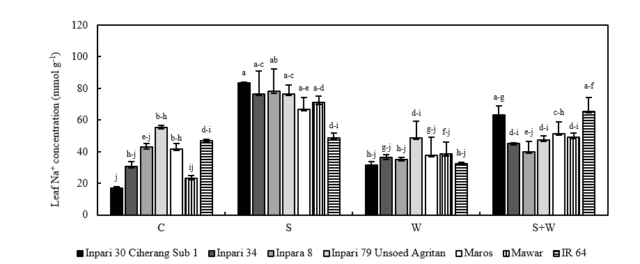 Figure 1 Interaction between stress conditions and rice varieties on leaf Na+ concentration at 8 WAP. Remarks: Bars represent mean values of 3 replicates with error bars showing the standard error (SE). Different letters represent significant differences in the interaction between stress conditions and rice varieties based on DMRT at α = 5%; C (control); S (salinity); W (waterlogging); S + W (dual salinity and waterlogging).