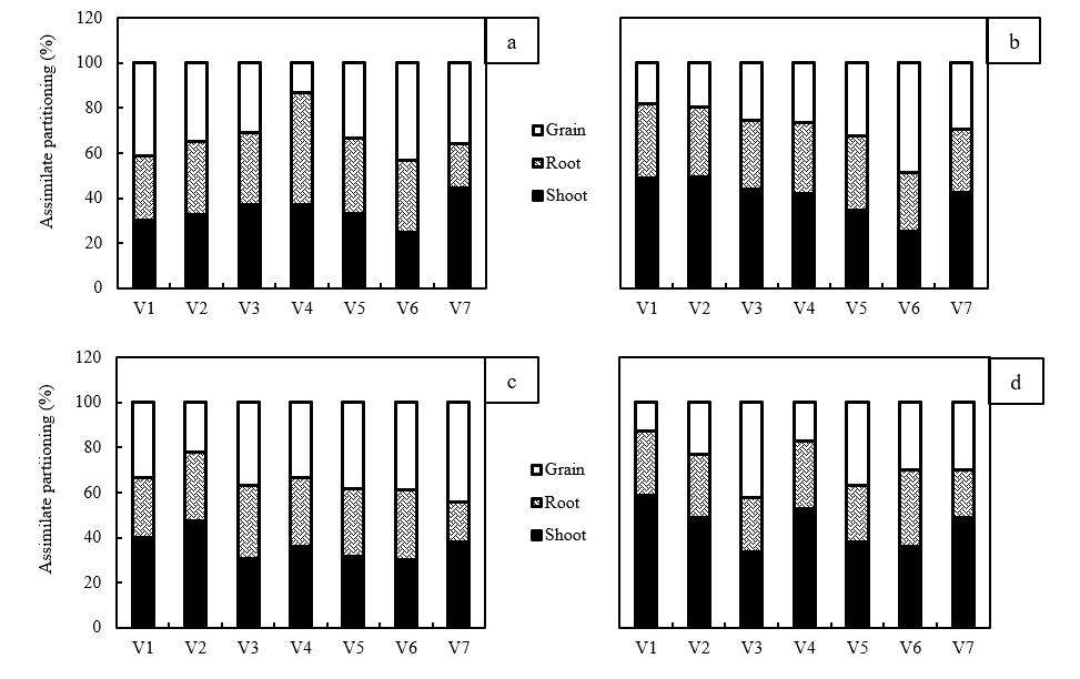 Under waterlogging conditions, all tested rice varieties demonstrated relatively balanced translocation of assimilates (Figure 4(c)). The results showed that under waterlogging stress, assimilate partitioning to the shoot and grain increased by 6.4% and 6.4%, respectively, while it decreased in the roots by 13.1%. Water availability in waterlogged conditions supports optimal growth, even under stress conditions. When rice plants under anaerobic conditions, increased formation of aerenchyma for exchange facilitates the venting of O2 to the roots and shoots [49]. Furthermore, photosynthesis activity continues, as some leaf organs remain above the water surface. Plants under waterlogging conditions maintain the capacity to light intercept, as a portion of their leaf organs remain exposed above the water. Under submerged conditions, rice plants form a leaf gas film that facilitates the exchange of O2 and CO2 for supporting photosynthesis activity [50].