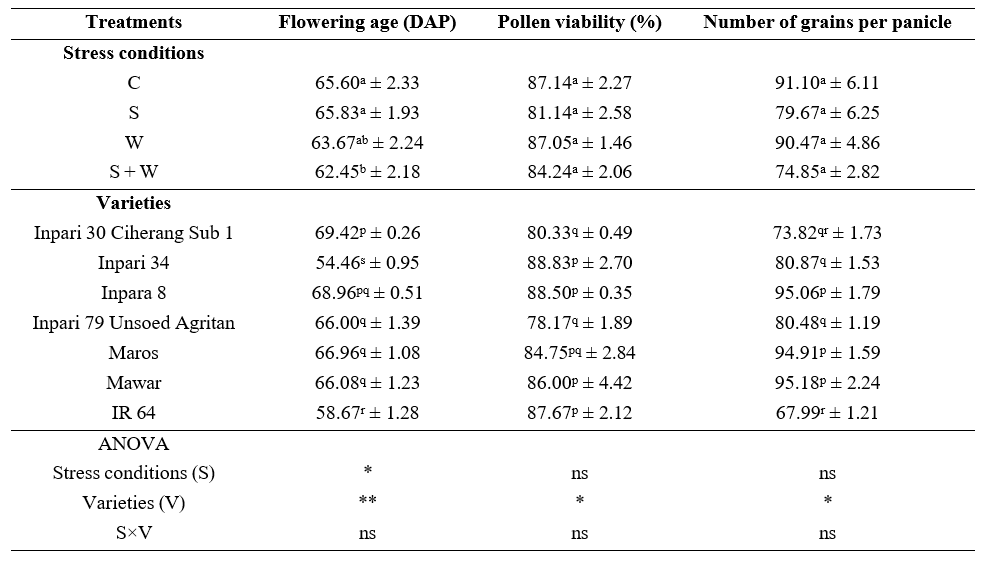 Pollen viability significantly influences the percentage of filled grains, as higher viability enhances fertilization success and subsequent grain development. Rice varieties that exhibit tolerance to salinity and waterlogging stress generally produce a higher percentage of filled grains, whereas susceptible varieties tend to yield fewer. All tested rice varieties showed reduce levels of filled grains under salinity. However, certain varieties, including Inpara 8, Inpari 79 Unsoed Agritan, Maros, and Mawar increase in percentage of filled grain under waterlogging or dual salinity and waterlogging. In contrast, Inpari 34 and IR 64 experienced a reduction in percentage of filled grain under all stress conditions, including salinity, waterlogging, and dual salinity and waterlogging (Table 3).