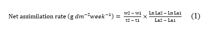 Where W2 represent plant biomass at 8 WAP and W1 plant biomass at 4 WAP, t2 represent time 8 WAP and t2 time 4 WAP, La2 represent leaf area at 8 WAP and La1 leaf area at 4 WAP.
