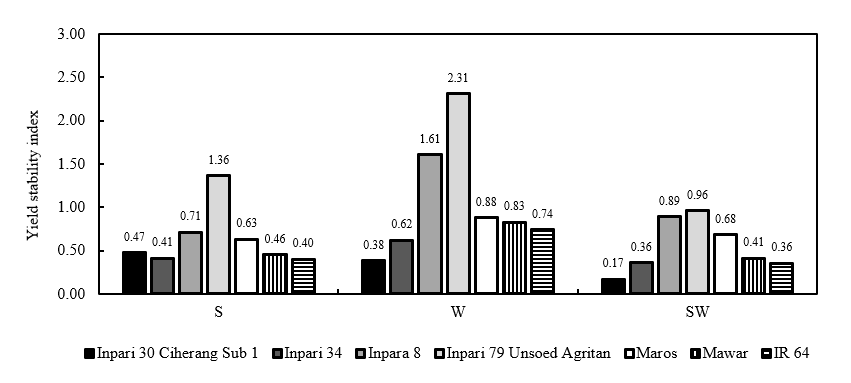 The stability of rice variety adaptability under stress relies on the yield stability index (YSI), which reflects a variety’s capacity to maintain yield across diverse environmental conditions. According to the study results, the Inpari 79 Unsoed Agritan variety, despite having a relatively low grain yield, exhibited the highest YSI under various stress conditions. In contrast, the Inpari 30 Ciherang Sub 1, Inpari 34, and IR 64 varieties recorded the lowest YSI values, sggesting lower adaptability to fluctuating or adverse environments (Figure 6). A high YSI value reflects physiological tolerance to abiotic stress, likely associated with enhanced osmotic adjustment and increased antioxidant activity to mitigate ROS damage. Conversely, rice varieties with low YSI values likely lack critical genetic traits associated with salinity and waterlogging tolerance, rendering them more vulnerable to oxidative stress, impaired metabolic function, and consequent yield reduction [68].