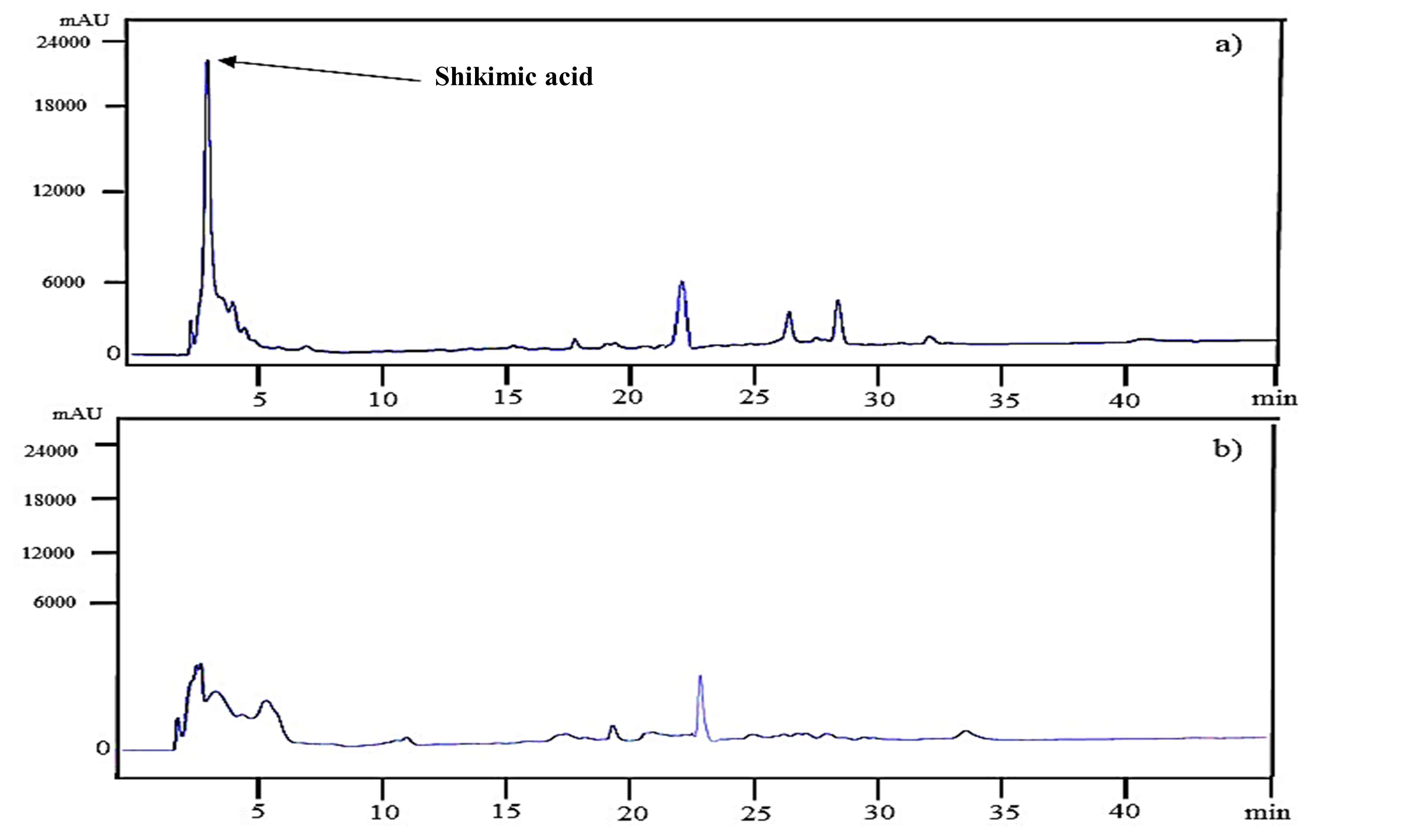 Figure 4 Chromatograms of a) high-intensity ultrasound-assisted extraction, and b) conventional extraction of Beta vulgaris stem powder.