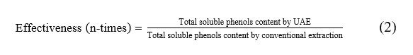 From the optimal high-intensity ultrasound-assisted extraction conditions obtained through response surface methodology analysis for soluble phenols, flavonoids, and anthocyanins, theoretical optimal high-intensity ultrasound-assisted extraction conditions for soluble phenols were selected for experimental validation of the model’s accuracy, comparing predicted and experimental values. The conventional extraction method was also compared to the optimal high-intensity ultrasound-assisted extraction conditions for soluble phenols in a 1-factorial experimental design. Additionally, soluble phenols, flavonoids, anthocyanins, DPPH, ABTS, and FRAP (as described in previous sections) were evaluated, along with their effectiveness. The efficacy of high-intensity ultrasound-assisted extraction was assessed by applying Eq. (2) [35].