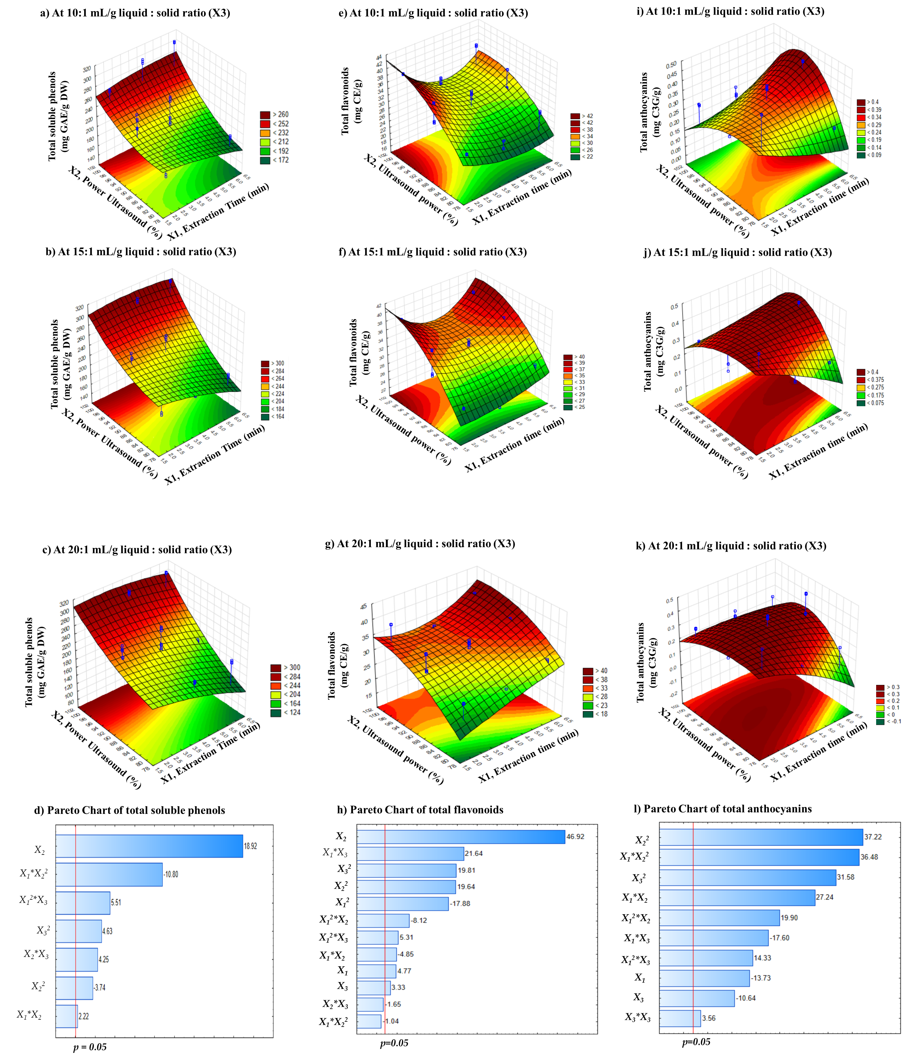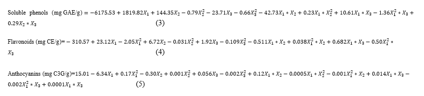 Y: is the projected response (soluble phenols, flavonoids, and anthocyanins), b0 is model constant, bi are model coefficients in its linear form, bii are model coefficients in its quadratic form, bij is the model interaction coefficient, xi and xj stands for the coded levels of the independent variable (extraction time, ultrasound power, and liquid-to-solid ratio), and ɛ is the experimental error.