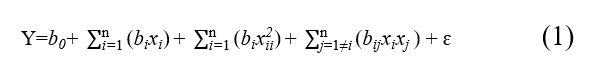 Following the quantification of all dependent variables, the response surface method was employed to identify the optimal high-intensity ultrasound-assisted extraction conditions for extracting soluble phenols, flavonoids, and anthocyanins from the B. vulgaris stem powder. Therefore, a polynomial model (2nd order) incorporating all the terms (linear, quadratic, and interaction) was applied to forecast the response (Eq. (1)).