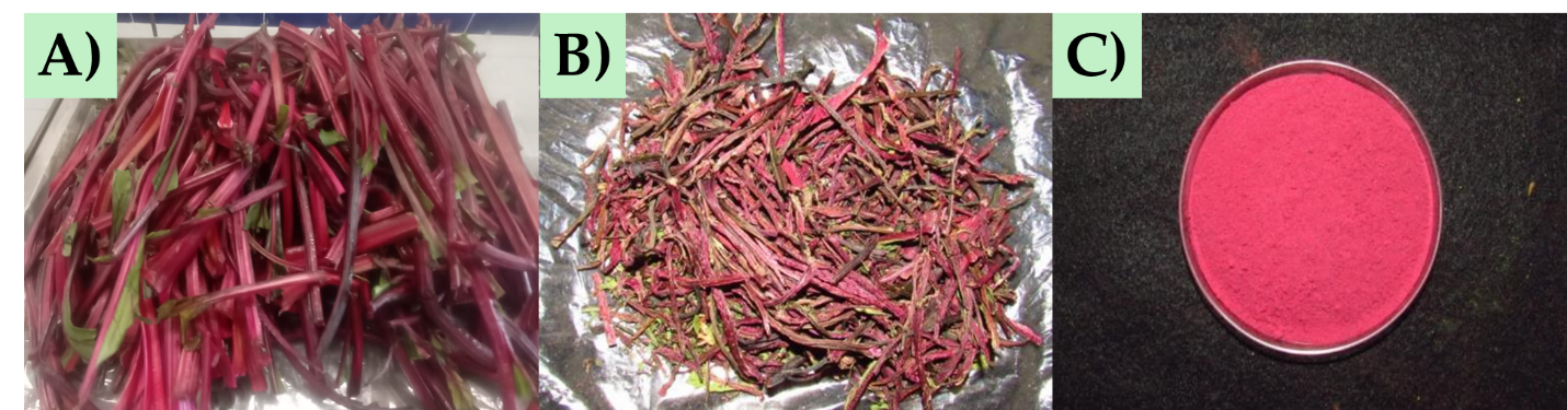 Beta vulgaris stems (Figure 1(A)) were donated from a local market at Tepatitlan, Jalisco, México. B. vulgaris stems were cleaned with potable water and dehydrated in a convective drying oven (Memmert GmbH, Schwabach, Germany) at 40 C for 24 h (Figure 1(B)) [11]. Subsequently, the B. vulgaris stems were ground using a Nutribullet® food processor and sieved through a 35-mesh screen (Humboldt, AASHTO M92, IL, USA) to produce a fine powder (< 500 µm), as shown in Figure 1(C). The B. vulgaris stem powder was stored under refrigeration (4 C) away from light exposure for further analysis. All chemicals and reagents employed in this investigation were of analytical and HPLC grade.