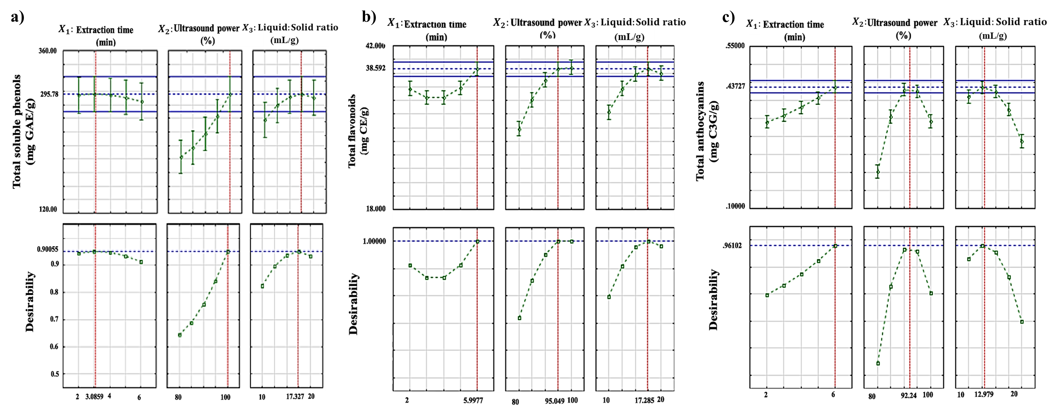 The experimental design was established employing STATISTICA software v. 10 (Statsoft, Tulsa, OK, USA). A Box-Behnken design was implemented for 3 factors (X1, X2, and X3), 3 levels (–1, 0, +1), and 3 central points, with 15 experimental runs (in a random sequence to reduce systematic errors) to determine the optimal high-intensity ultrasound-assisted extraction conditions. The 3 independent variables were extraction time (X1, 2, 4, and 6 min), ultrasound power (X2, 80%, 90% and 100%), and liquid-to-solid ratio (X3, 10:1, 15:1, and 20:1 mL/g). The responses investigated were soluble phenols (Y1, mg of gallic acid equivalents per gram, GAE/g), flavonoids (Y2, mg of cathechin equivalents per gram, CE/g), anthocyanins (Y3, mg of cyanidin-3- O-glycoside per gram, C3G/g), DPPH (Y4, mmol of Trolox equivalent per gram, TE/g), ABTS (Y5, mmol TE/g), and FRAP (Y6, mmol TE/g).