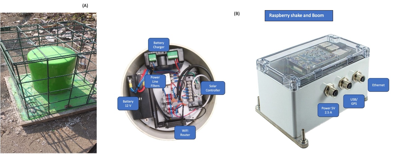 Figure 2 Field deployment of a local station at the monitoring site. (a) The physical installation of the sensor housing. (b) Internal components of the UGM antenna station, including the power supply system, solar controller, and Wi-Fi router. The Raspberry Shake device used for data acquisition is shown on the right. Although not visually depicted, a wind noise reduction system was integrated into the sensor setup during field deployment.