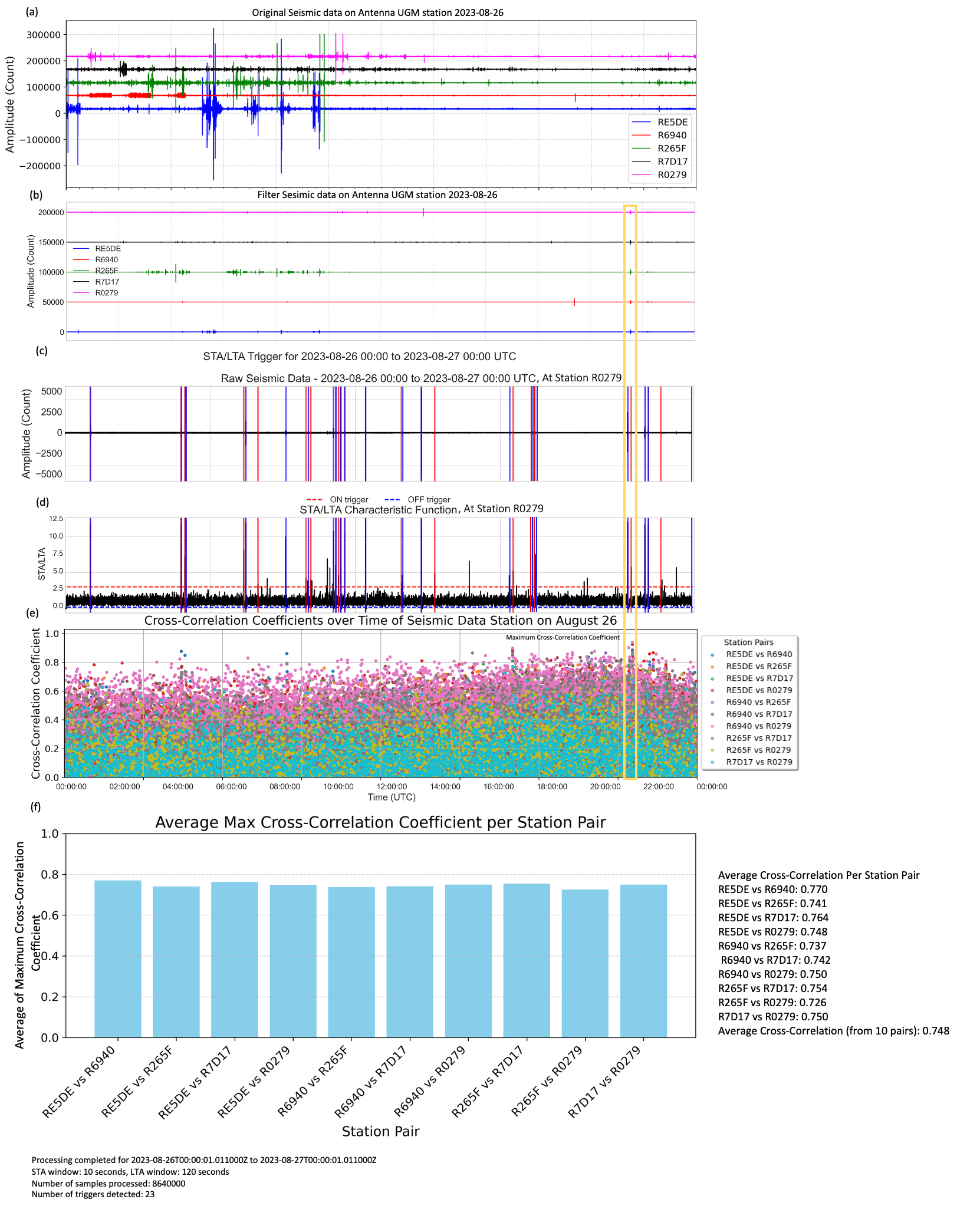 Figure 5 Multi-station analysis of seismic signals recorded on 26 August 2023, from the UGM Antenna array network. (a) Raw seismic waveform data from 5 stations: RE5DE (blue), R6940 (red), R256F (green), R7D17 (black), and R0279 (magenta). Variations in amplitude reflect both signal characteristics and local site conditions. (b) Filtered seismic data after applying a Butterworth bandpass filter (0.8 - 1.8 Hz). (c) STA/LTA event detection a station (R0279) using the short-term average (STA) to long-term average (LTA) ratio. Red vertical lines indicate trigger onset times (“ON trigger”), and blue lines indicate trigger end times (“OFF trigger”). (d) Characteristic function of STA/LTA applied to station R0279, showing detection peaks. The y-axis represents the STA/LTA ratio. Positive values correspond to high short-term signal energy relative to the long-term average. Negative values result from preprocessing artefacts; and values are clipped for clarity to highlight high signal-to-noise ratio detections. (e) Cross-correlation coefficients between all station pairs calculated from detected windows on 26 August 2023. Each dot represents the maximum cross-correlation value for a pair in a specific window. The highest observed coefficient is 0.938. (f) Average maximum cross-correlation coefficient for each pair of stations on 26 August 2023.
