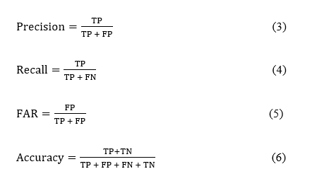 To support the detection results, precision, recall, and false positive rate were employed as quantitative metrics to further evaluate detection accuracy. Several standard evaluation measures were applied to quantitatively assess the performance of the proposed UGM antenna station monitoring system, as summarised in Table 1.