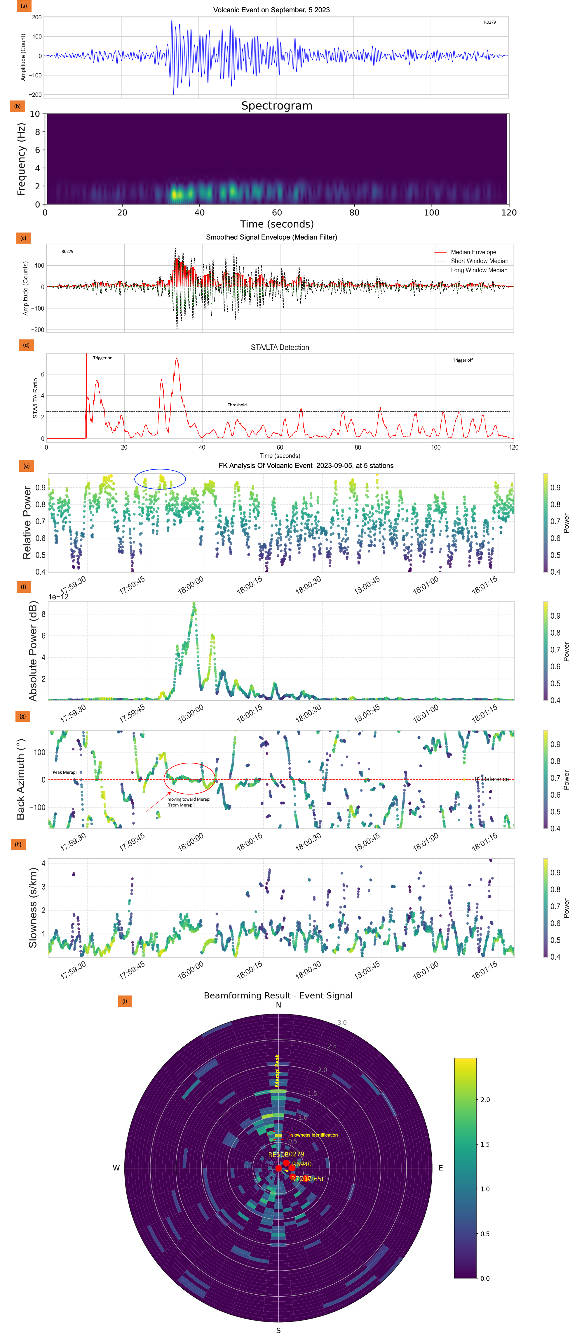 Figure 9 Analysis results of a volcanic event recorded on September 5, 2023. (a) The raw waveform of the recorded volcanic event. (b) The corresponding spectrogram shows the dominant frequency content. (c) Smoothed signal envelope using a moving median filter to suppress impulsive noise and highlight wave phase arrivals. (d) Event detection using the STA/LTA algorithm, with detection threshold indicated. (e) FK analysis results show (e) relative power, (f) absolute power, (g) back azimuth, and (h) slowness of the signal across time. (i) The beamforming result indicates the direction of wave propagation in polar coordinate.