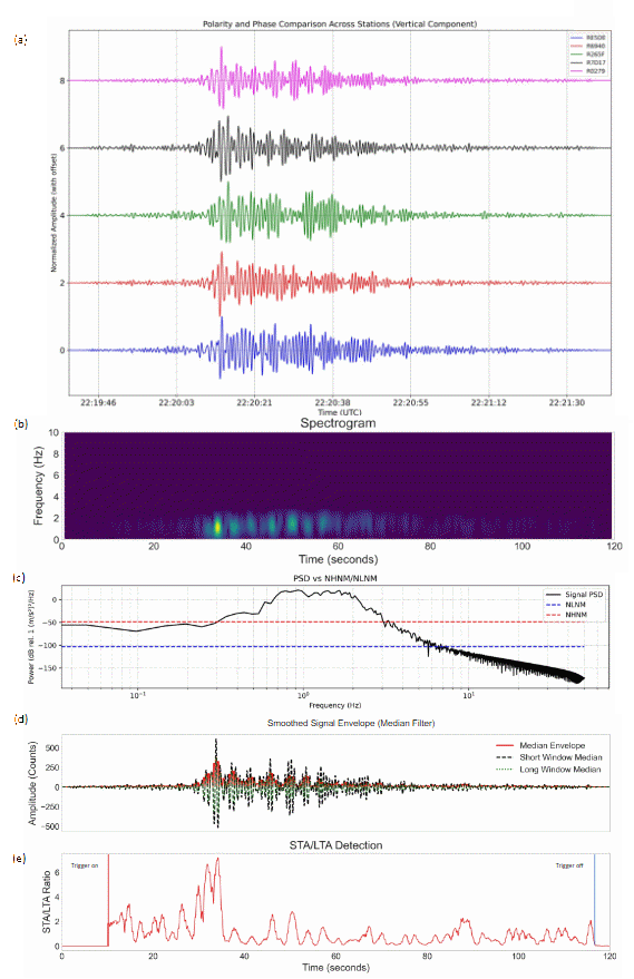 Figure 6 Characteristics of seismic signals and the automatic event detection process based on vertical component data from seismic observation stations on 26 August 2023. (a) Comparison of wave polarity and phase across several seismic stations using normalised vertical traces. (b) Spectrogram illustrating the time-frequency distribution of the signal. (c) Power Spectral Density (PSD) of a seismic signal recorded at Merapi Volcano (black line), with the New High Noise Model (NHNM, red dashed line) and New Low Noise Model (NLNM, blue dashed line) from the New Manual of Seismological Observatory Practice (NMSOP). (d) Smoothed signal envelope obtained using a median filter, highlighting significant amplitude variations. (e) Result of automatic event detection using the STA/LTA (Short-Term Average/Long-Term Average) method, indicating the estimated onset and end times of the detected event.