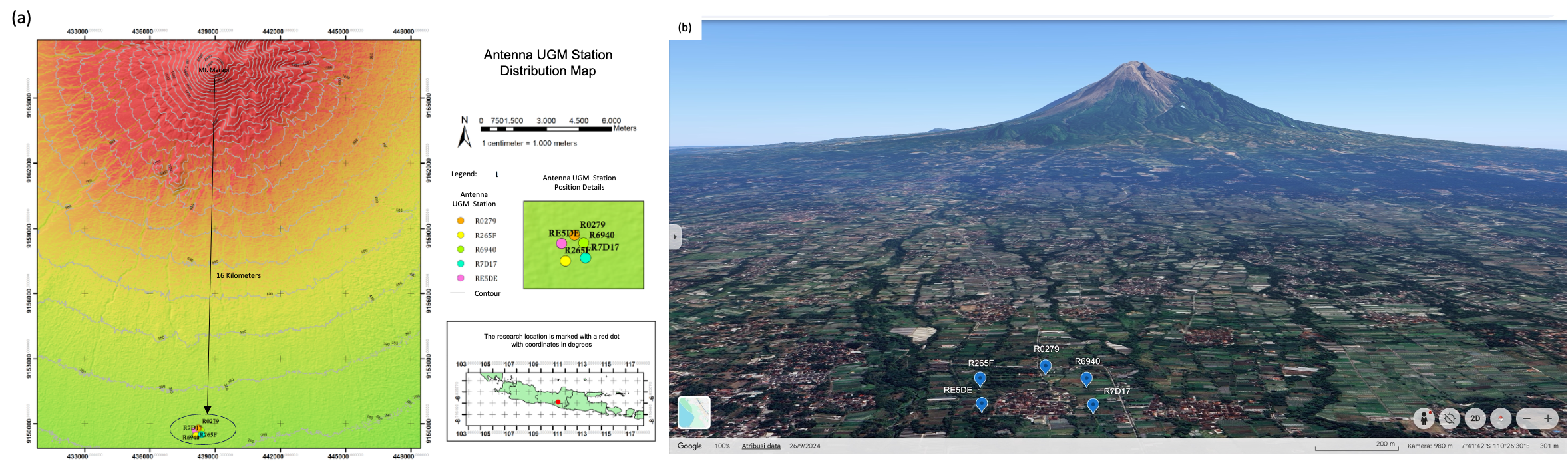 Figure 1 Distribution of UGM antenna stations (blue circles), located approximately 16 km south of the volcano. (a) Map showing station locations overlaid on a high-resolution topographic base. (b) 3D perspective view from Google Earth illustrating the spatial arrangement of UGM antenna stations in the southern lowlands relative to Merapi Volcano (Source: https://earth.google.com/).