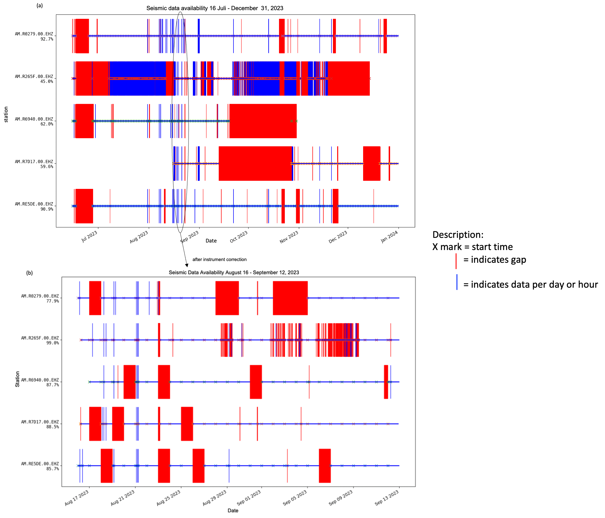 Figure 3 (a) Summary of seismic data availability from July to December 2023. (b) Final dataset used for analysis in this study, showing rectified data availability following instrumentation changes. Each station’s data span 28 consecutive days, from 16 August to 12 September 2023.