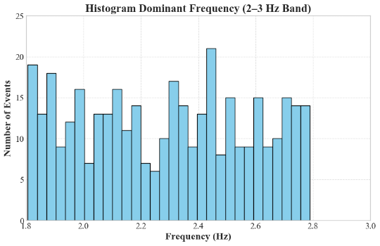 Figure 6 Histogram of dominant frequencies extracted from seismic events, showing a distribution mainly within the 2 - 3 Hz band.