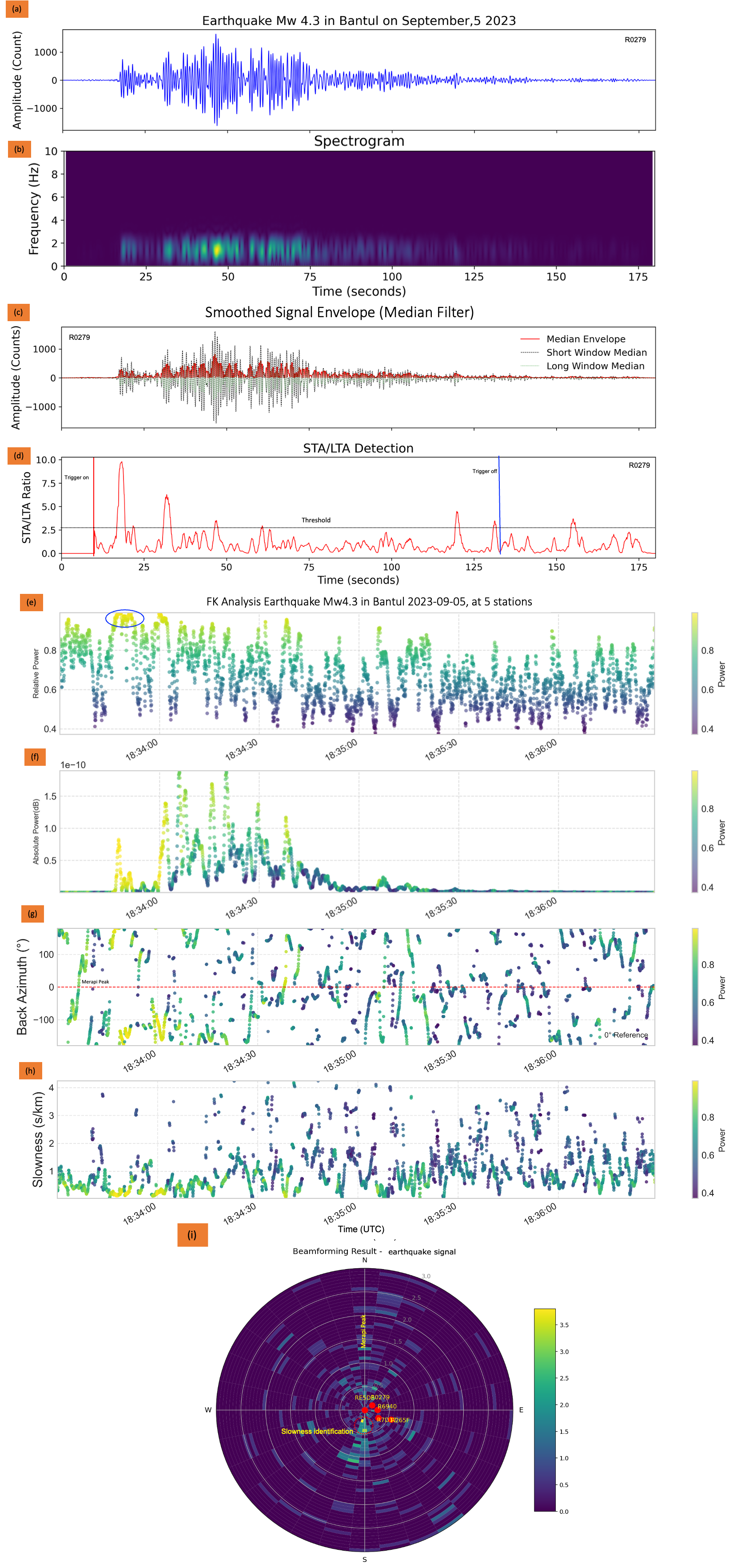 Figure 8 Illustrates analysis of the Mw 4.3 earthquake recorded at station R0279. (a) raw waveform. (b) corresponding spectrogram showing dominant frequencies. (c) smoothed envelope highlighting wave arrivals. (d) STA/LTA event detection. (e-h) FK results showing relative power, absolute power, back azimuth, and slowness. (i) beamforming polar plot indicating wave propagation direction.