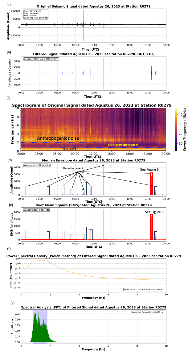 Figure 4 Seismic signal processing steps applied to the daily waveform recorded on 26 August 2023, at station R0279. (a) Raw seismic waveform with background noise and transient events (original Signal). (b) Filtered waveform using a 0.8 - 1.8 Hz Butterworth bandpass filter. (c) Spectrogram of the original signal shows persistent noise bands and the selected filter range. (d) Median envelope of the filtered signal highlighting high-energy transients. (e) RMS amplitude of the filtered signal using a 5-second window. (f) Power spectral density (PSD) illustrating dominant energy within the filter band. (g) Amplitude spectrum confirming energy concentration between 0.8 - 1.8 Hz.