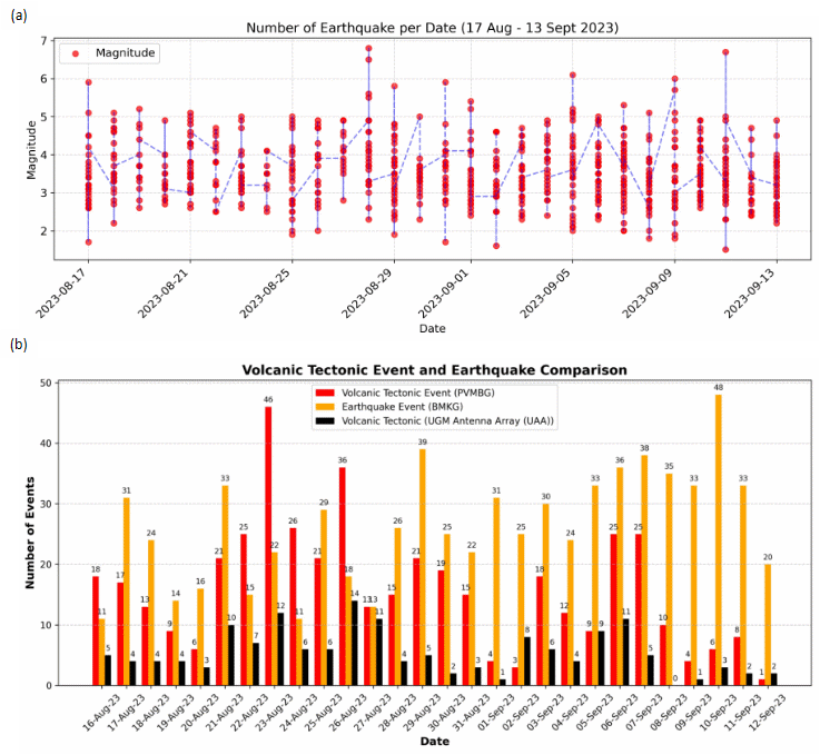 Figure 11 Comparison of volcanic and tectonic earthquake event data from multiple sources between 16 August and 12 September 2023. (a) Daily distribution of earthquake magnitudes recorded by BMKG. (b) Daily counts of volcanic-tectonic (VT) events detected at the UGM Antenna Array using FK and beamforming methods (black bars), compared with tectonic events recorded by BMKG (orange bars) and VT events reported by PVMBG (red bars). The plot highlights agreements and discrepancies among local and national observations, emphasising the utility of antenna-based detection systems for monitoring VT activity.