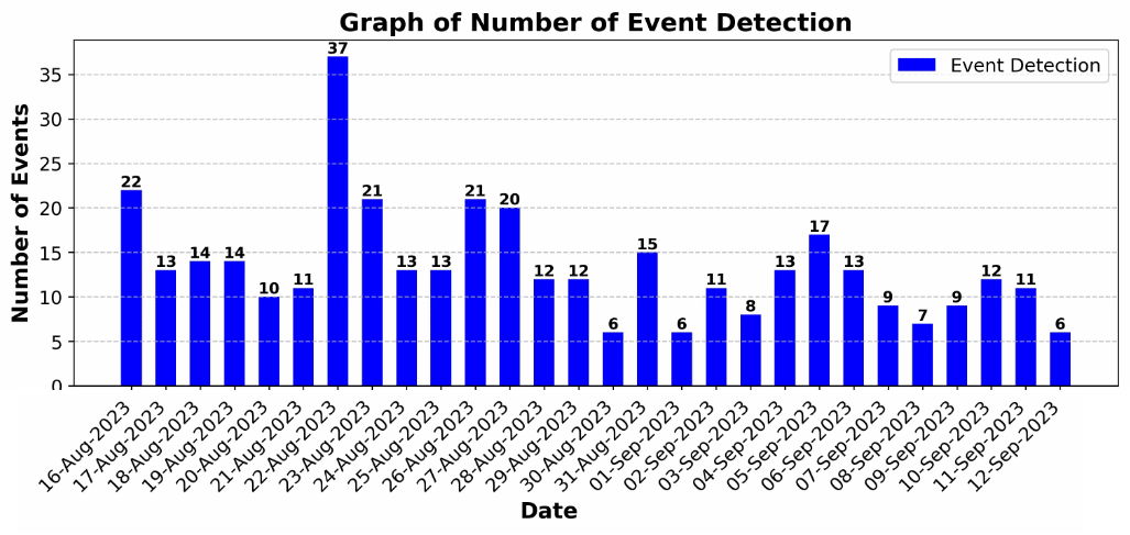 A total 376 tectonic volcanic events were detected using the STA/LTA detection method applied to continuous data collected from 16 August to September 12 2023. These events were verified using beamforming and FK analysis methods to confirm simultaneous wave arrivals across multiple stations.
