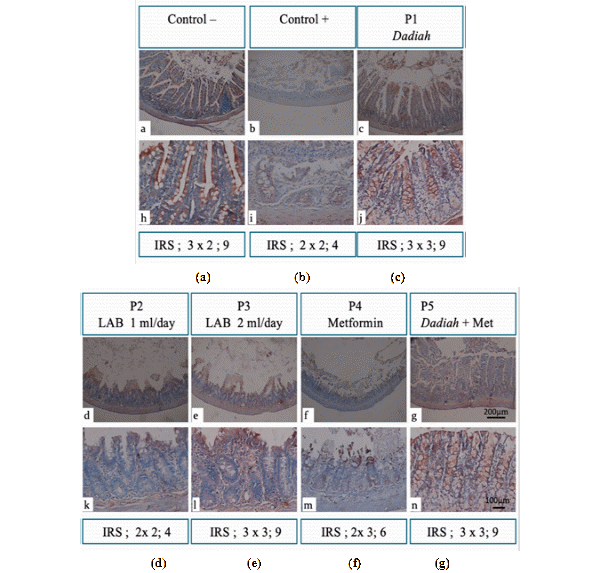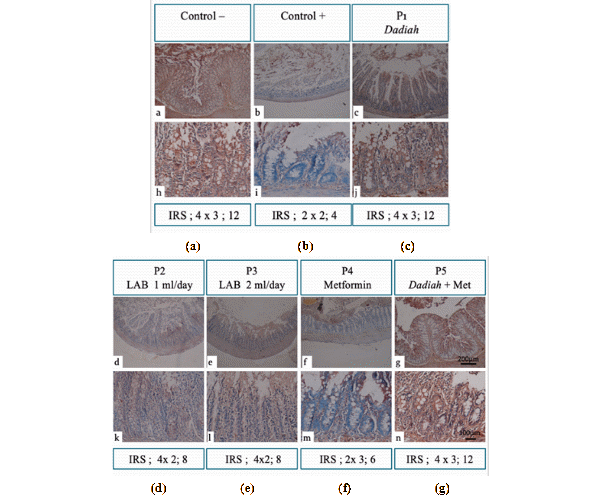 Immunohistochemical analysis showed IgA expression in epithelial cells, stromal cells, and mucosal extracellular matrix. C+ rat showed mucosal atrophy and the lowest IgA expression. C−, P1, P3, and P5 mice, on the other hand, had thicker mucosa and more IgA expression (> 80 % positive cells). P2 rat showed a similar phenomenon to C+, while P4 rats showed intermediate results. A combination of Dadiah and Metformin increases IgA expression compared to C+. Immunoperoxidase. Scale g: 200 μm; n: 100 μm.
